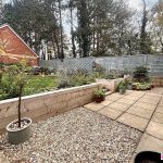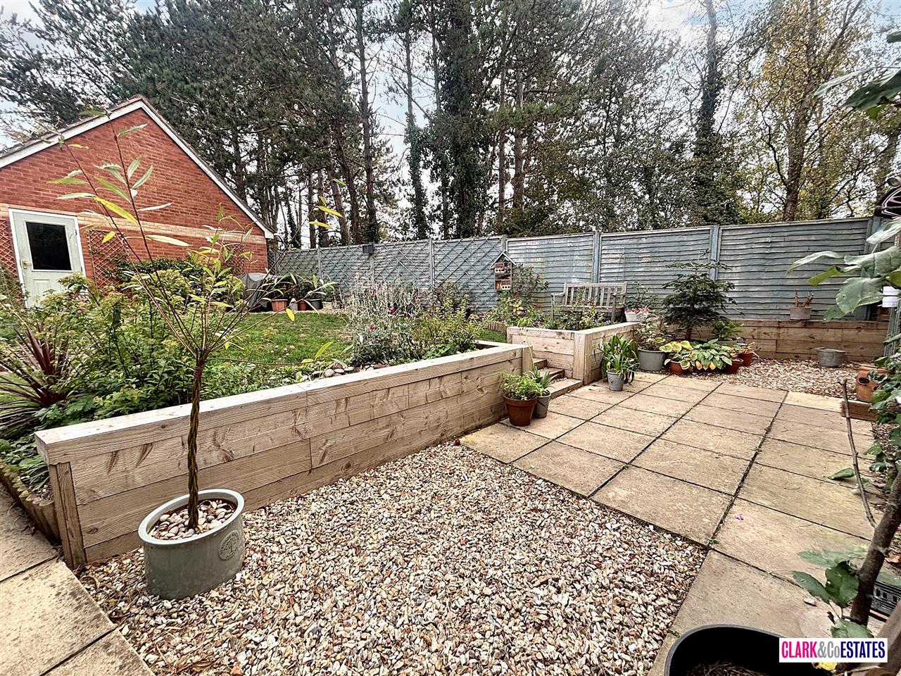 Doors open onto a charming enclosed rear garden, featuring a lovely patio area that provides the perfect spot for outdoor seating. Raised planters are filled with an assortment of attractive shrubs, complemented by a feature pond. Steps lead up to a lawned section and a gravelled area at the back. A gate offers separate access, while a door connects directly to the garage, which benefits from power and lighting. The garage also includes an up-and-over door leading to the driveway.