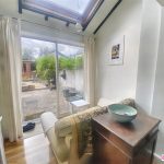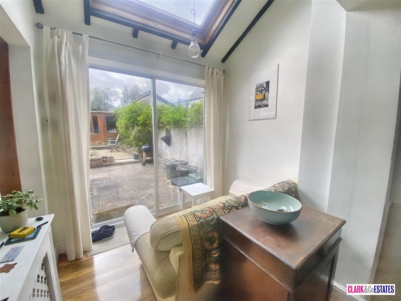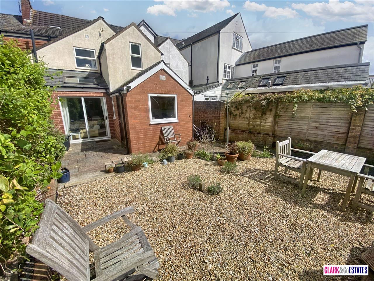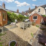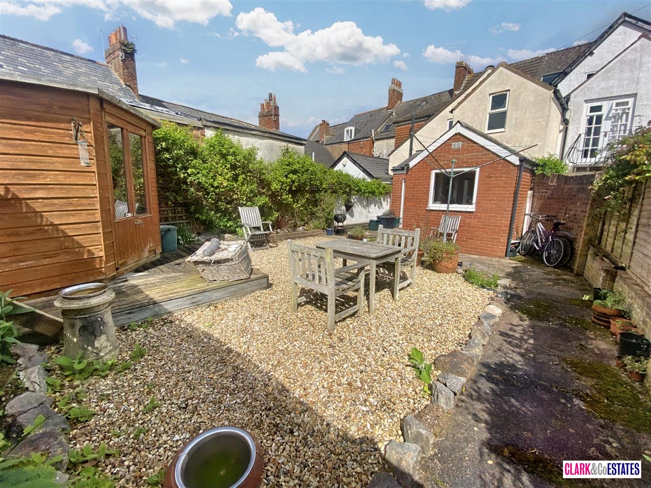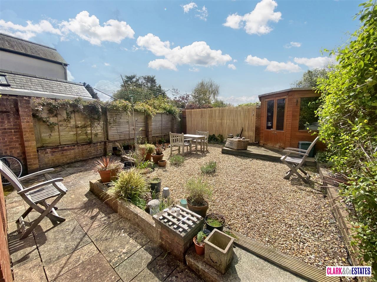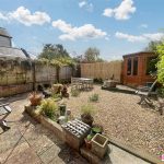 Rear sunny courtyard garden with raised decking and summer house. Storage to the side. Double doors into the open plan downstairs living.