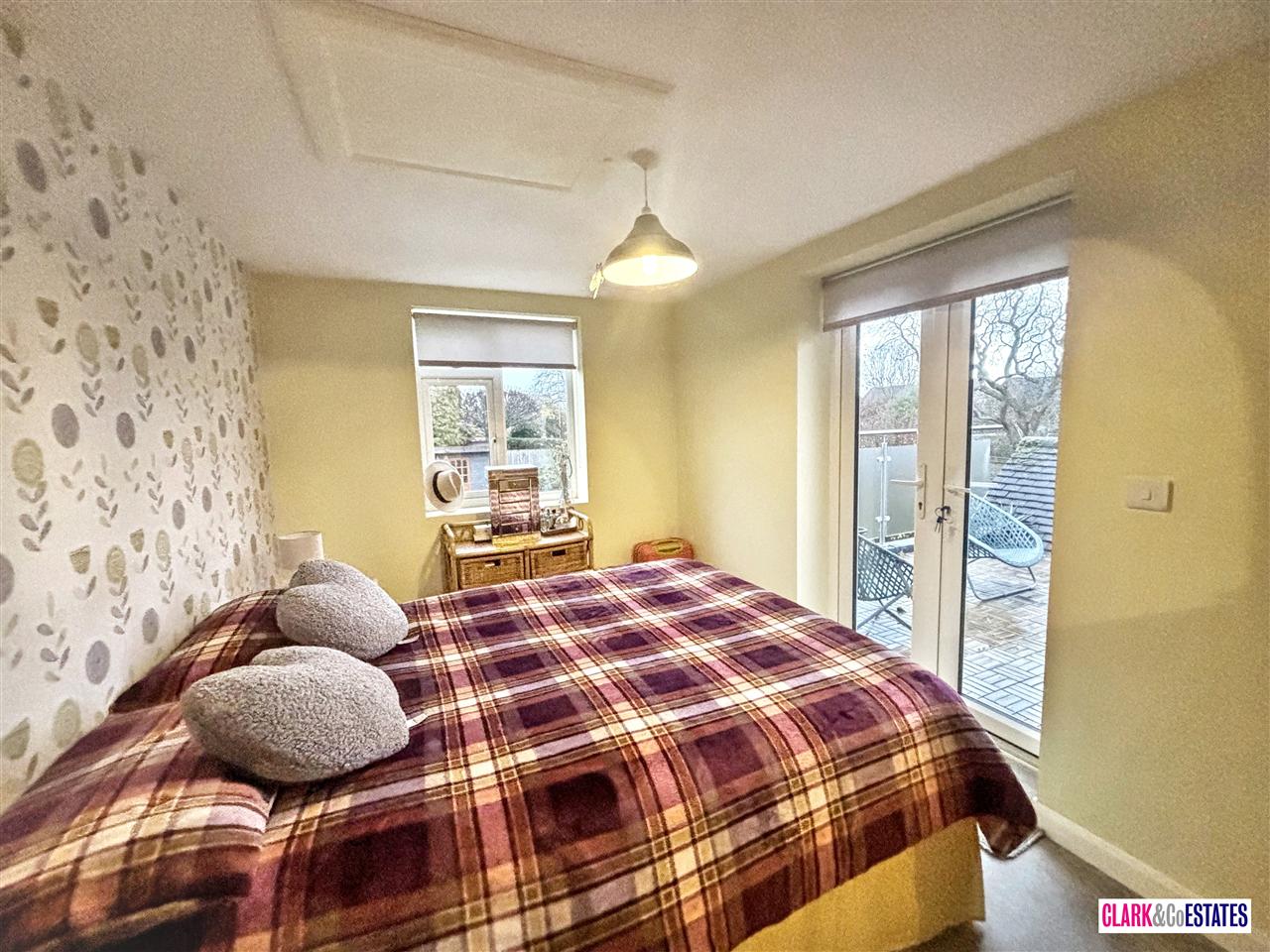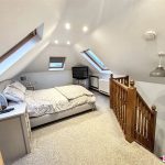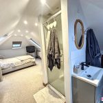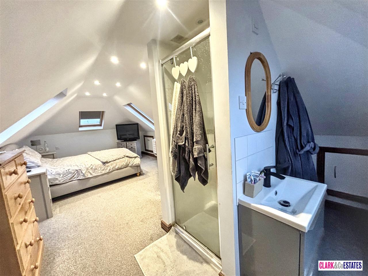 Large master bedroom with ample storage and en suite shower with sink. Storage space into the eves. Fitted wardrobes and drawers. Delightful views over the garden