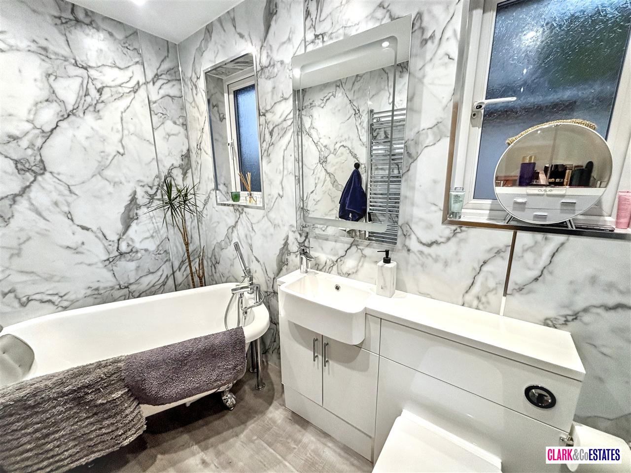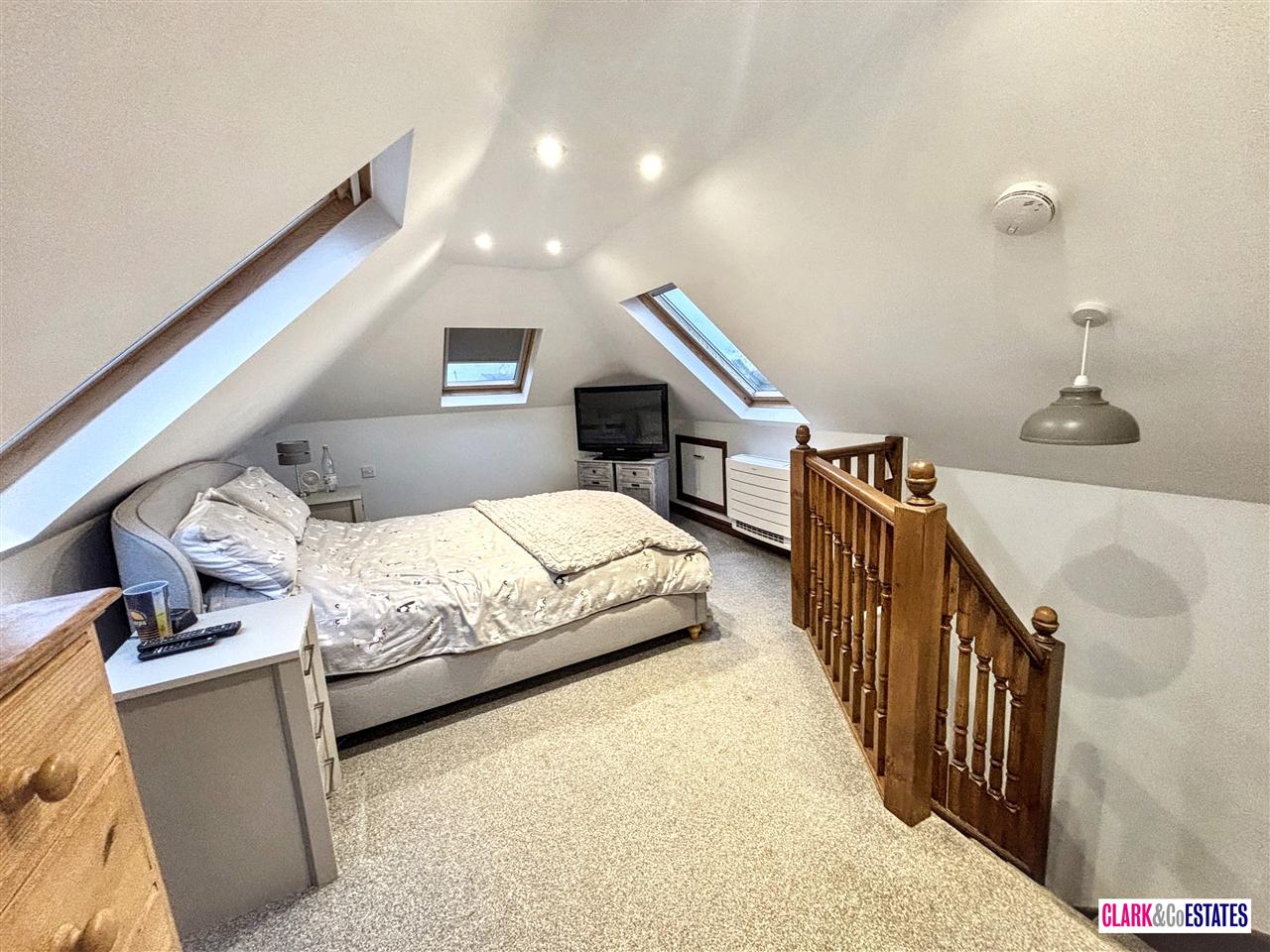 Third bedroom with storage space, currently housing CCTV controls. Fourth bedroom to the front of the property, also with fitted wardrobes. Main bathroom with roll top bath and separate shower room.