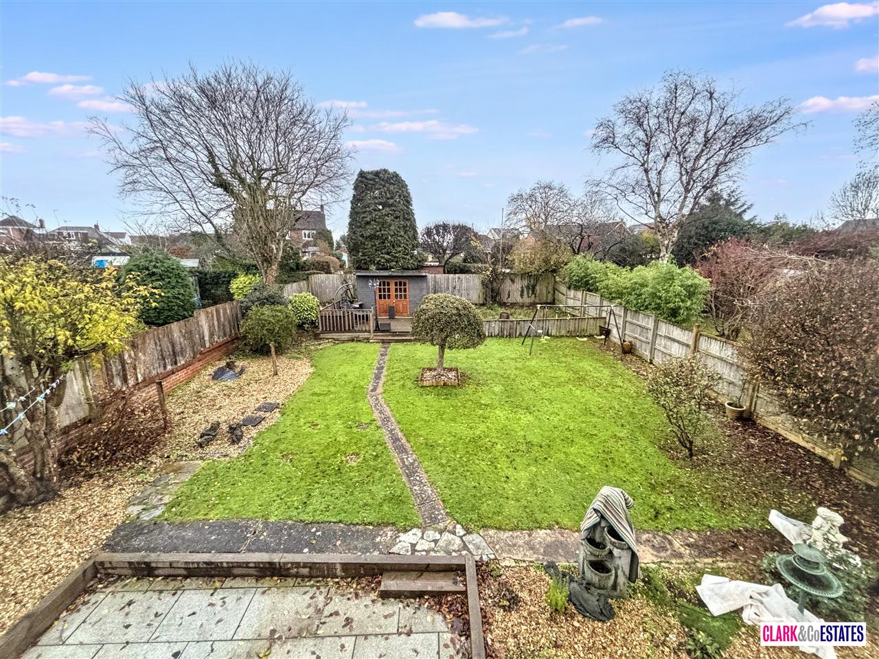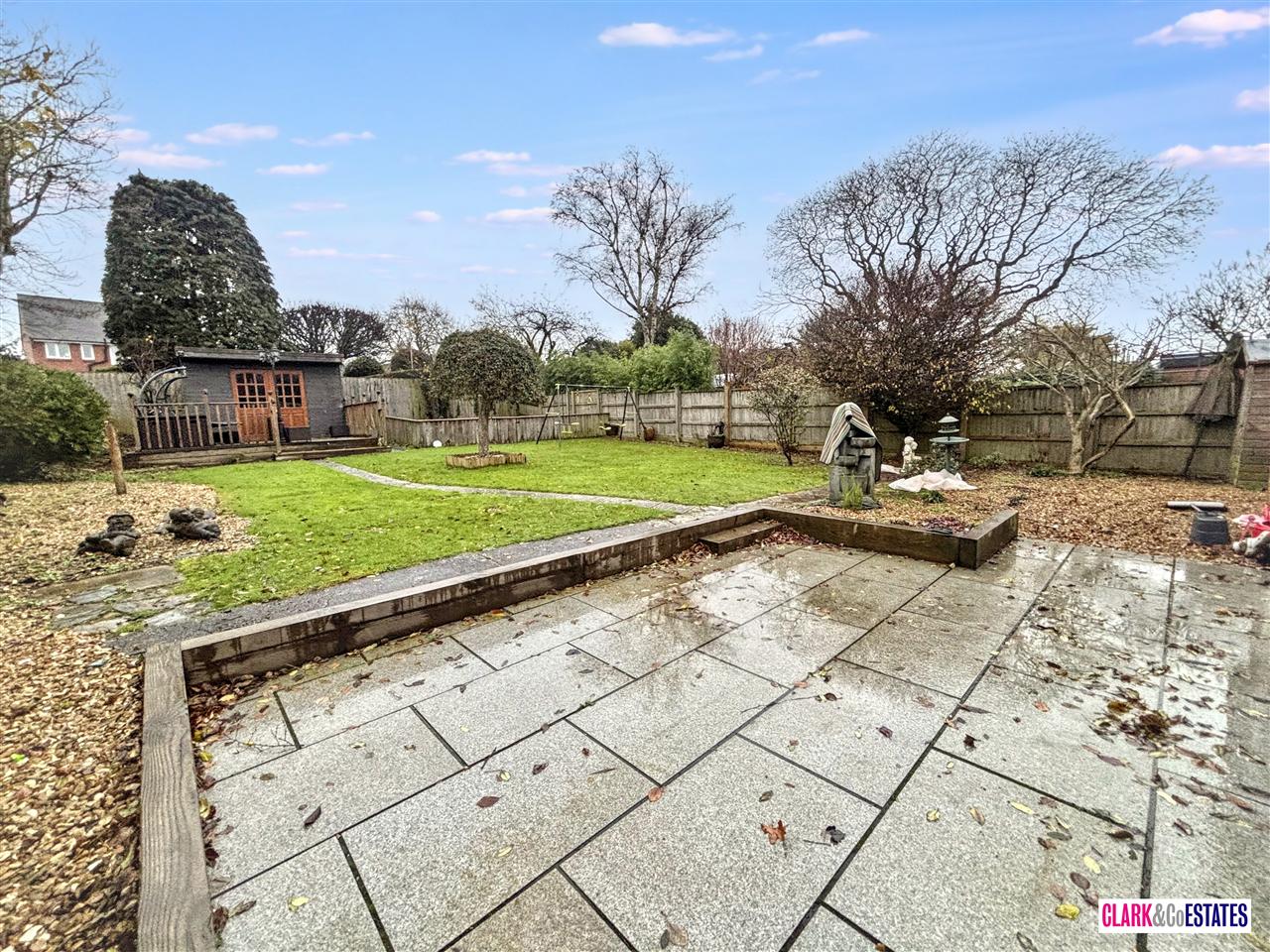 Large garden with a patio, decking area with summer house and the rest laid to lawn. Large driveway with parking for several cars. The garage can be access via the rear garden and also via the front.