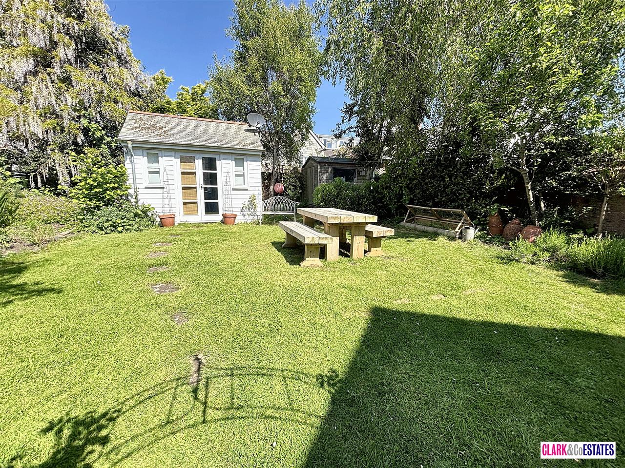 Large lawned area to the rear with a summer house with electricity and garden shed. Courtyard area ideal for al-fresco dining and access to the garage/workshop