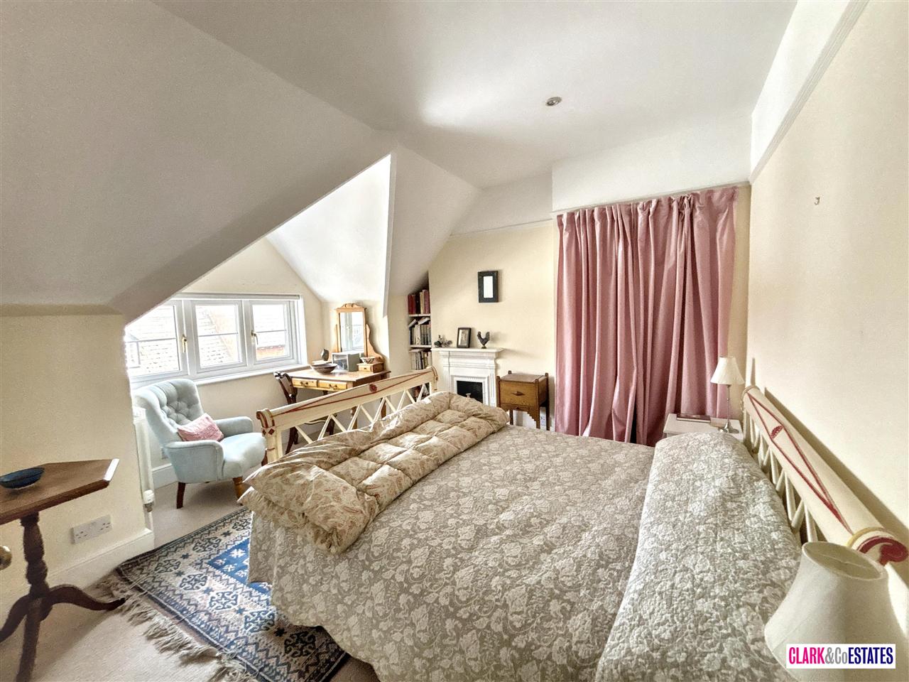 Spacious landing with doors to all rooms and access into the eaves which boasts great storage. To the front is a good size bedroom with a decorative period fireplace and an ensuite shower room. to the rear is a further bedroom which is currently used as a studio