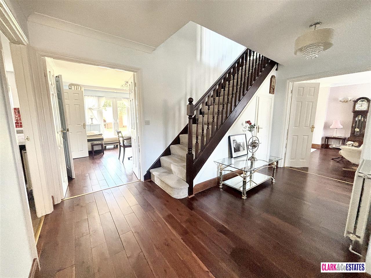 Spacious entrance hall with stairs rising, understairs storage and a WC. To the front of the property is a spacious study which has also previously been used as a fifth bedroom. Dual aspect lounge with double doors to the rear garden, feature fires and further double doors to the dining room. The dining room again, has double doors to the rear garden and separate doors to the kitchen and hallway. Fitted kitchen breakfast room with a selection of integrated appliances and an outlook to the rear. Utility room to the front with a door to the side.