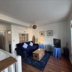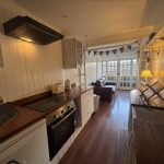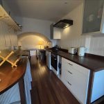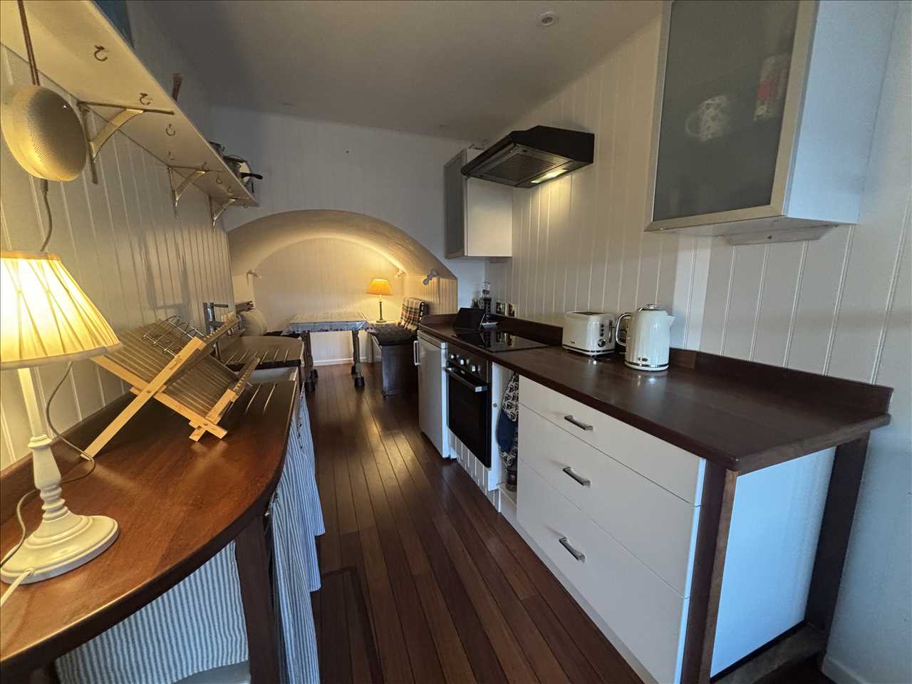 KITCHEN/DINING/SNUG 29'8" (9.04m) x 7'1" (2.16m) at most This beautiful space is open plan but separated into fairly defined areas and designed in a ship's galley style, with solid work surfaces over framing with shelving and three pull out wicker drawers. Inset sink with mixer tap. Electric hob with oven and extractor hood above. Fridge/freezer. Mahogany wood laminate flooring throughout. Brass halogen down lighting. At the back of the room is a charming barrel ceilinged area that could be arranged as a seating area. TV point. Dimplex night storage heater. Towards the front of the room is a space used as a dining area with wooden French doors opening onto Strand.