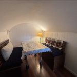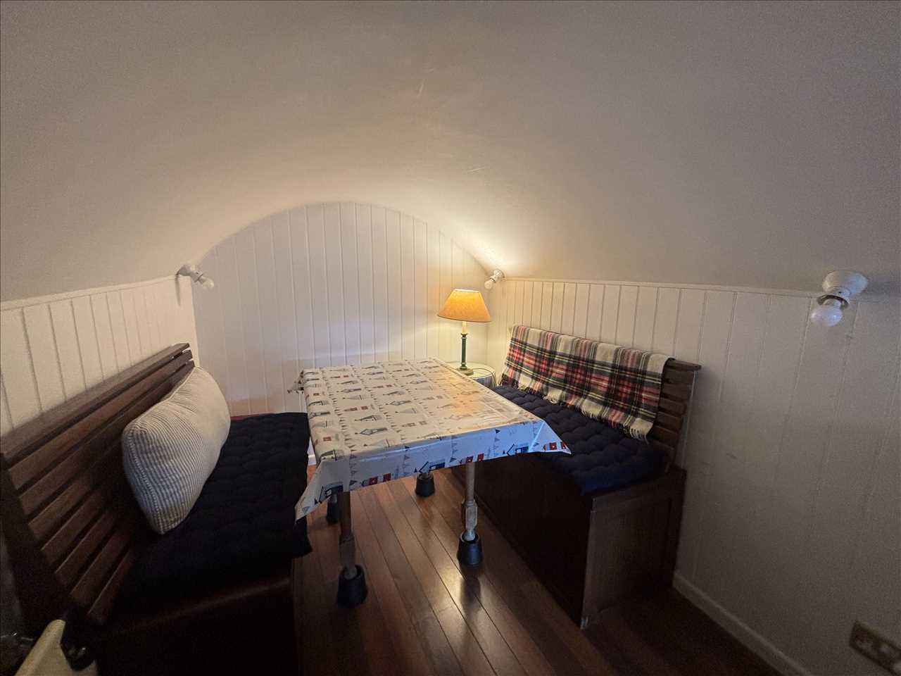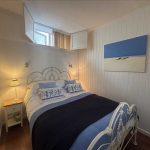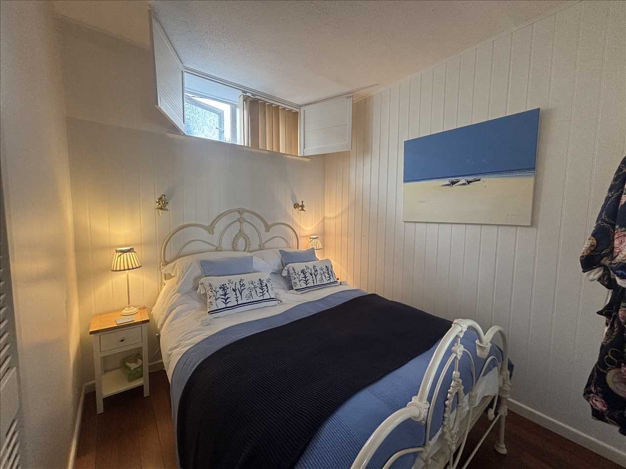window with shutters. Two ship cabin style bedside lights. Sliding, slatted door. Small paned period window borrowing light from the sitting room. Electric panel heater.