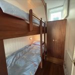BEDROOM TWO 6'9" x 5'3" (2.06m x 1.6m) A terrific second bedroom with fixed mahogany Pullman style bunk beds each with opening porthole window at the foot, and each with cabin style bedside lights in brass. Fitted mahogany wardrobe with drawer under. Raised, obscure glazed window with shutters. Electric panel heater.