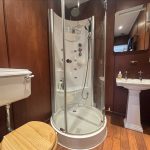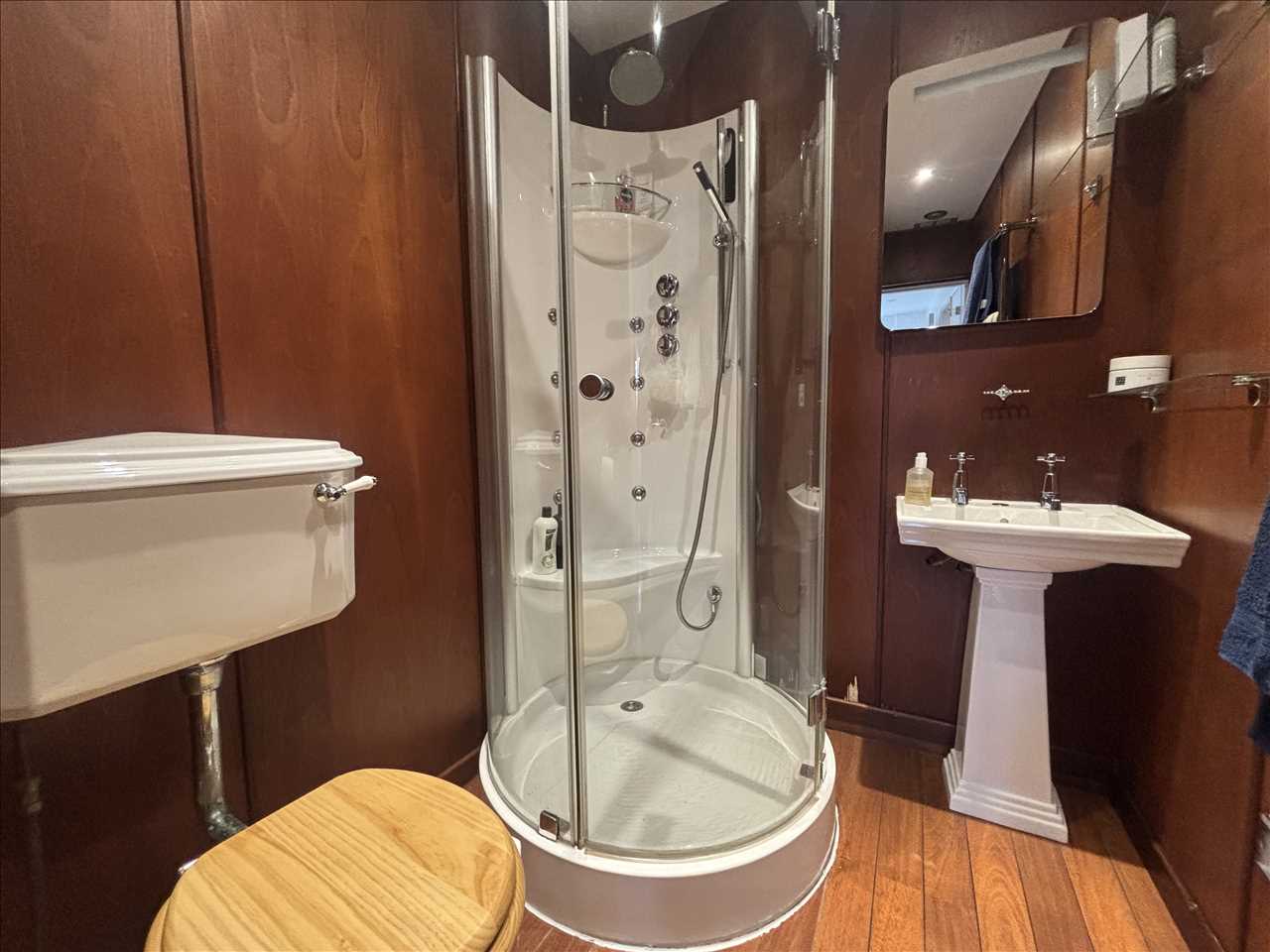 A fitted room in the art deco style with mahogany panelled walls and wood laminate flooring. 1920s style pedestal wash hand basin with mirror over, WC and curved shower cubicle. Ladder style electric towel rail. Extractor fan. Built-in cupboard with Ariston pressurized hot water system and washer/drier.