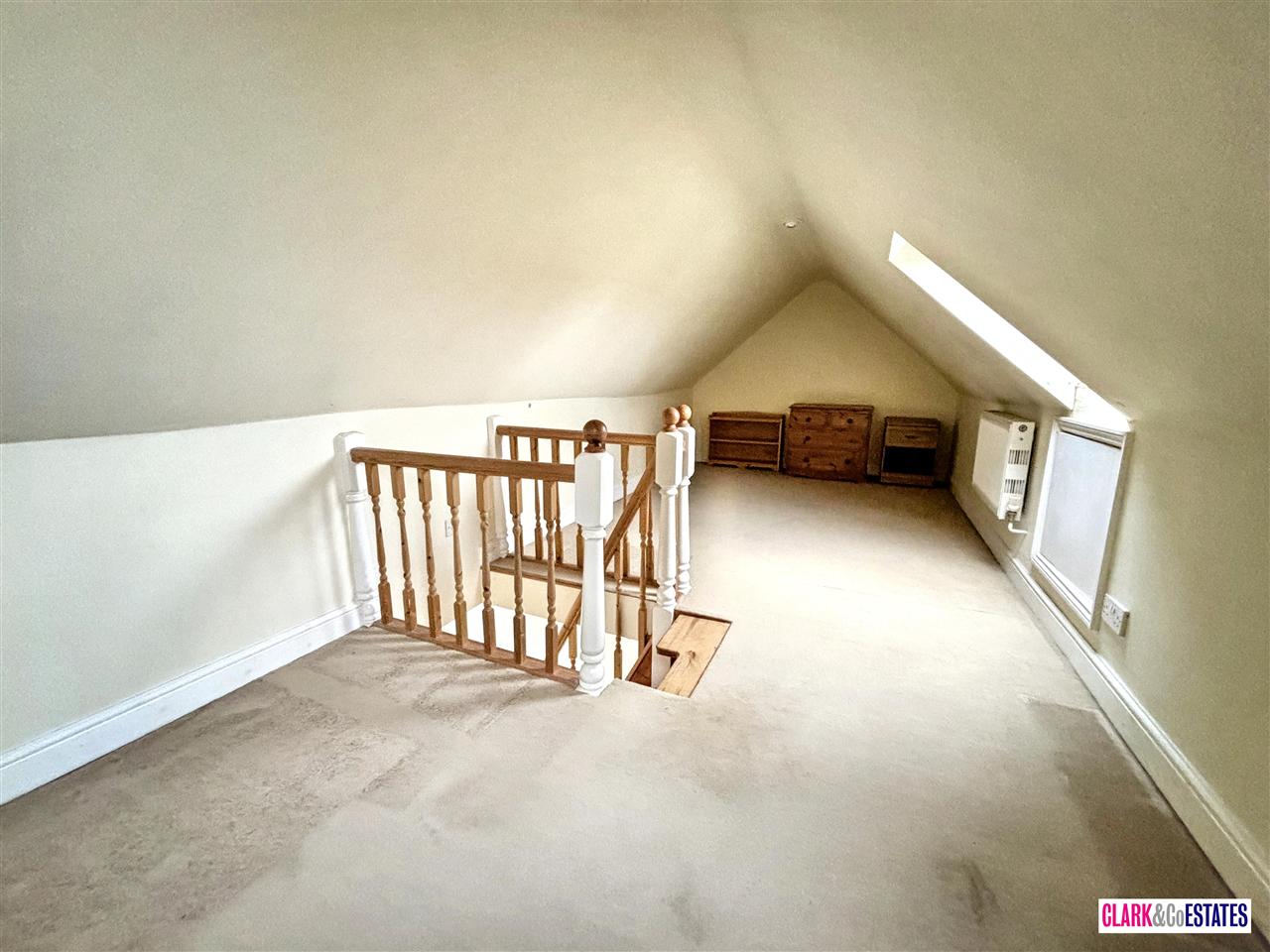 Sizable attic room which could either work as a home study or a further bedroom. Storage in the eaves.