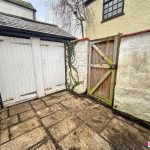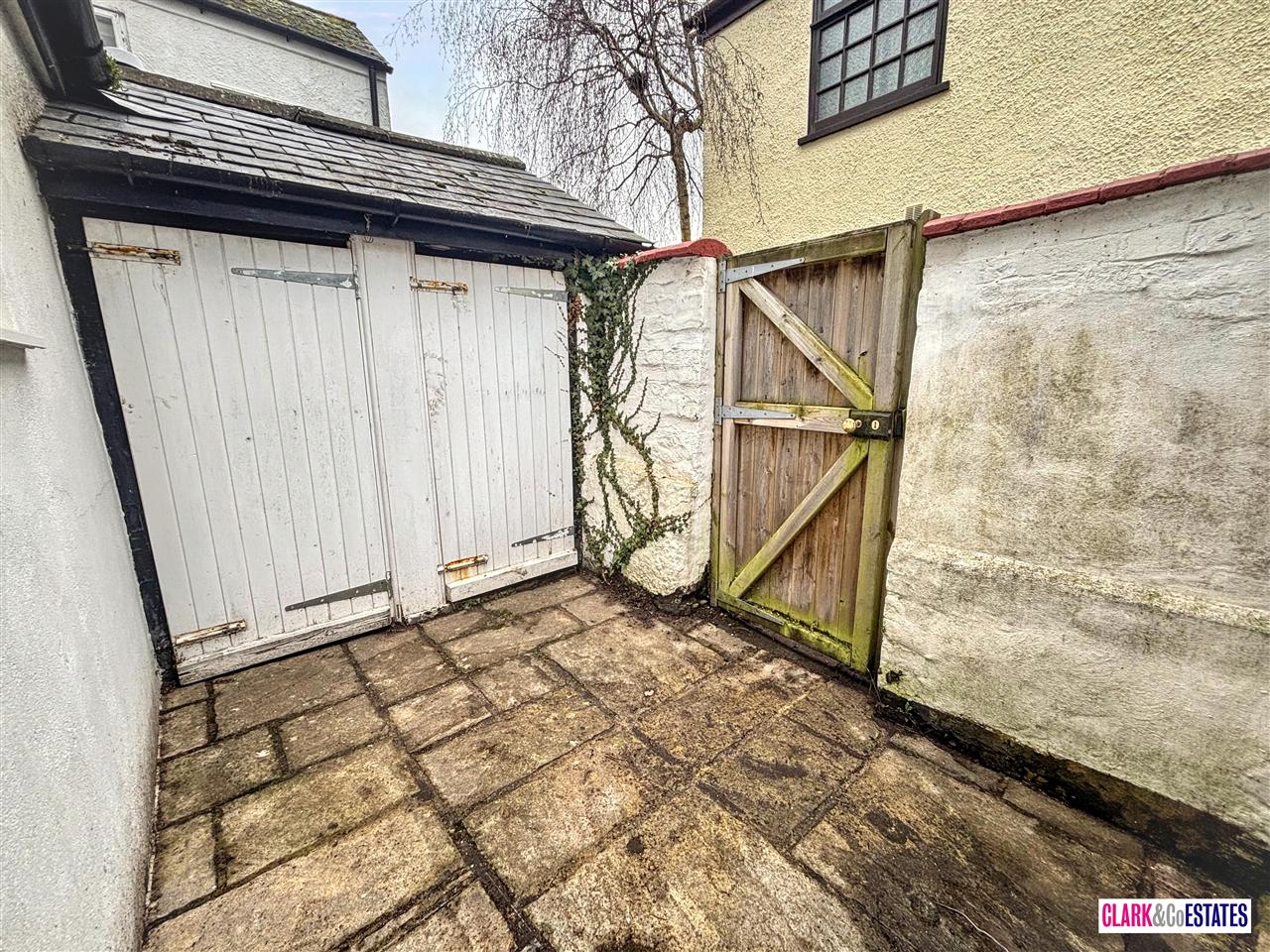 Rear courtyard garden with two storage sheds and a secure gate leading to a rear service lane. To the front is a lawned garden with a stone walkway to the front door.